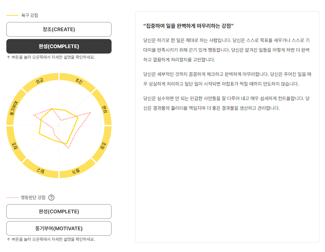 태니지먼트 측 설명에 따르면, 욕구 강점은 높으나 행동판단 강점이 낮다면, 해당 강점과 관련해 타고난 잠재력은 충분하지만 지금 하고 있는 일에서 이 강점을 발휘할 기회가 부족하기 때문일 거라고 한다. 음.. 한마디로 나는 뭔가 '추진'하는 재능은 있지만 기회가 부족했다는 것 같다.