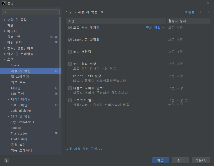 을 체크해 두면 저장 시 코드가 정렬된다. 원래 Ctrl+Alt+L 로 쓰던 기능이 바로 이거다.
