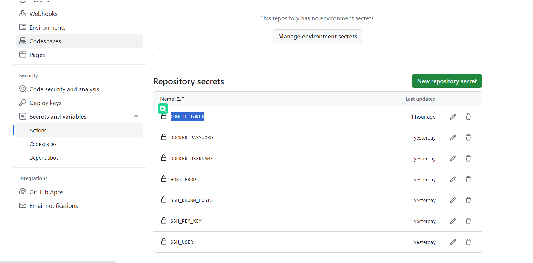 내 리포지토리에 secret으로 등록해 둔 정보들은 다음과 같다