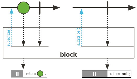 이 Mono를 구독하고 다음 신호를 받을 때까지 무기한으로 블록 합니다. 그 값을 반환하거나, Mono가 빈 상태로 완료되면 null을 반환합니다. Mono가 에러를 발생시키는 경우, 원래의 예외가 (체크된 예외인 경우 RuntimeException으로 래핑 되어) 던져집니다.