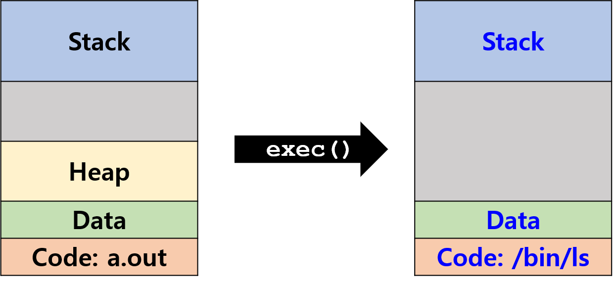 exec()을 하게 되면 기존의 a.out 프로그램은 새롭게 부른 /bin/ls에 의해서 덮어지게 된다.