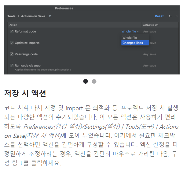 여러가지 새로운 기능들이 생겼지만 개인적으로 가장 반기고 있는 기능은 바로 저장 시 액션. VS code의 format on save 같은 기능인데, 인텔리제이에서도 플러그인 형태로 쓸 수 있었지만 저장할 때 렉이 걸린다던가 IDE가 꺼지는 등의 이슈가 있어서 사용을 포기했었다.